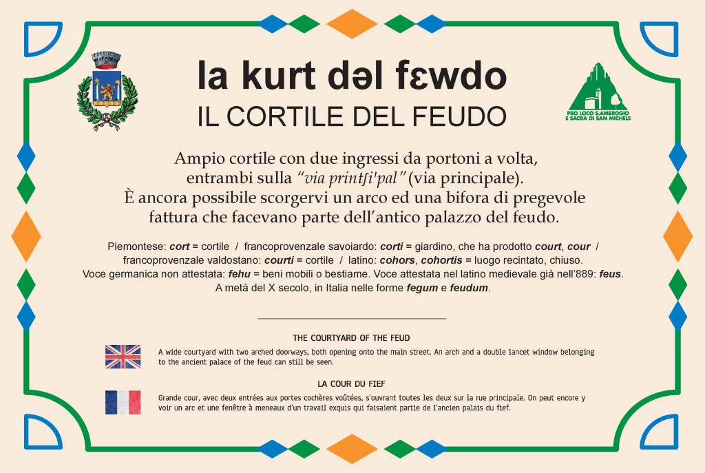 - Castello Abbaziale: antico palazzo del XII secolo strettamente legato alla Sacra di San Michele. Sito in corrispondenza dell’inizio della mulattiera, era il punto di controllo obbligato per chi volesse dirigersi al’abbazia, svolgendo quindi il doppio ruolo di difesa e accoglienza. Con la decadenza dell’abbazia, è stato danneggiato e saccheggiato più volte, diventando un rudere, restaurato negli anni Duemila e attualmente destinato a ristorante e hotel. Oggi si possono vedere la porta id accesso, la torre d’angolo pensile, alcuni merli e dei paramenti murari. Segnaliamo le terrazze, accessibili a tutti tramite una scala esterna sita sulla sinistra oltre l’ingresso.